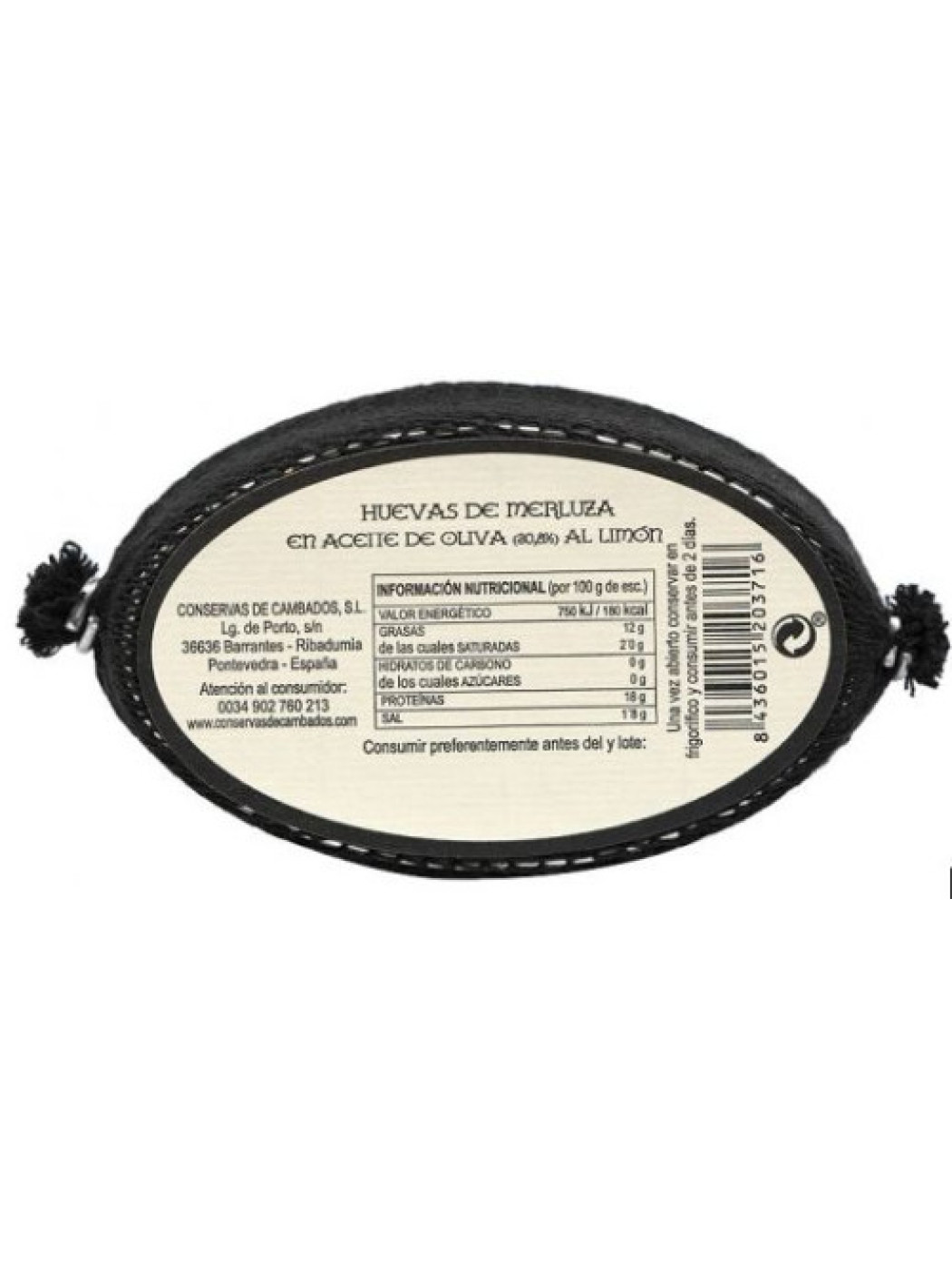 - Ingredientes: Huevas de merluza, aceite de oliva picante (30,8%), limón (4,3%) y sal